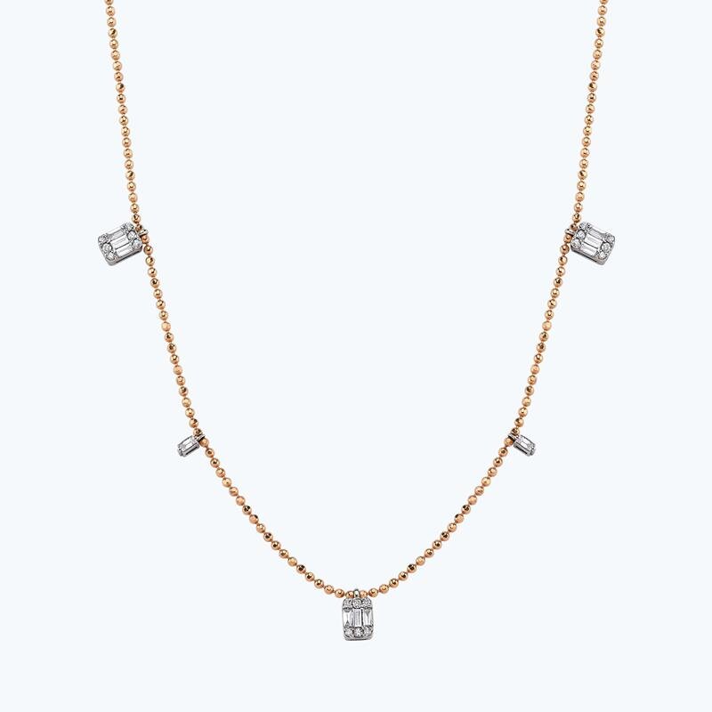 Dieses Baguette-Diamant-Halskette von Altınbaş Juwelier ist ein wahres Meisterwerk der Schmuckkunst. Sie verkörpert die Sanftheit der Liebe und strahlt ein strahlendes Licht aus, das die Schönheit jeder Frau unterstreicht. Dieses exquisite Schmuckstück ist das Epitom von Luxus und Reichtum und spiegelt die ununterbrochene Anmut wider, die Altınbaş auszeichnet. Die Halskette ist aus 14-karätigem Gold gefertigt, das in einem zarten Rosa-Weiß-Ton erstrahlt. Die Kombination aus Gold und Diamanten verleiht dem Schmuckstück eine pure Eleganz, die mit Präzision gefertigt wurde. Die Diamanten sind in Baguette- und Rundschliff ausgeführt, was die Halskette zu einem echten Blickfang macht. Die Diamanten sind von der Qualität G und SI, was für ihre herausragende Brillanz und Klarheit spricht. Jeder Diamant wurde sorgfältig ausgewählt und von unseren erfahrenen Juwelieren eingefasst, um ein harmonisches Gesamtbild zu erzeugen. Die Halskette ist ideal für Frauen, die ihren Stil mit einem Hauch von Luxus unterstreichen möchten. Sie passt perfekt zu eleganten Abendkleidern, kann aber auch ein schlichtes Outfit in ein glamouröses Ensemble verwandeln. Mit dieser Halskette von Altınbaş zeigen Sie nicht nur Ihren guten Geschmack, sondern auch Ihre Liebe zum Detail und zur Qualität. Erleben Sie den Luxus und die Eleganz, die diese Baguette-Diamant-Halskette von Altınbaş ausstrahlt. Lassen Sie sich von ihrem strahlenden Licht verzaubern und genießen Sie die bewundernden Blicke, die Sie damit auf sich ziehen werden.